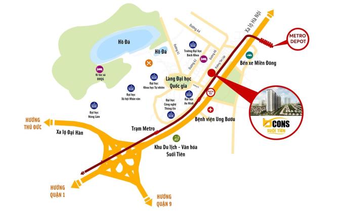 Thừa hưởng tiện ích ngoại khu hiện hữu tại Làng Đại Học: Bến Xe Miền Đông mới, Bệnh viện Ung Bướu CS2, Trạm cuối Metro, Big C, Copmart,…