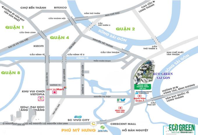 Chỉ mất 5 phút lái xe từ khu căn hộ Eco Green Sài Gòn Quận 7 đến trung tâm tài chính Khu Đô Thị Phú Mỹ Hưng , trường Đại học quốc tế RMIT, Đại học Tôn Đức Thắng, Viện Tim Tâm Đức, bệnh Viện Pháp Việt, siêu thị SC VivoCity, siêu thị Crescent Mall…