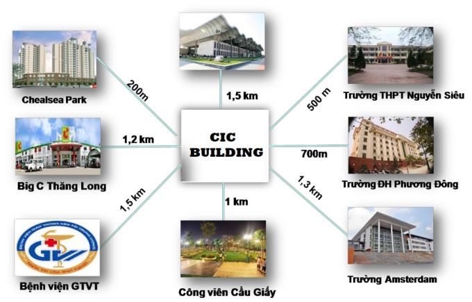 CIC Building tọa lạc tại Số 219 phố Trung Kính, phường Yên Hòa, quận Cầu Giấy, Hà Nội. Sở hữu vị trí đắc địa gần mặt đường Trung Kính một trong những con đường cái đi vào trung tâm quận Cầu Giấy và đi đến các quận như Đống Đa, Thanh Xuân. Nằm trên tuyến đường Trung Kính là nằm tại nơi có nhiều cơ quan quan trọng như Bộ Tài nguyên và Môi Trường, Bộ Nội Vụ, Tổng cục Hải Quan, Viện dầu khí Việt Nam, Viện kiểm sát nhân dân tối cao. Cách Kangnam 10 phút, Big C 15 phút di chuyển...