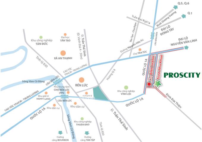 Đất nền phố Chợ Bình Chánh chỉ cách Quốc lộ 1A 200m. Từ tuyến quốc lộ này đến khu dịch vụ thương mại như Ngân hàng, Bệnh Viện, Công Viên, Trung tâm mua sắm, Trường học... chỉ trong bán kính 1km. Chủ nhân Đất nền Bình Chánh Proscity được hưởng đa dạng tiện ích chất lượng cao ở khu vực phía Nam Thành Phố.