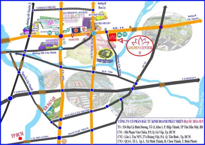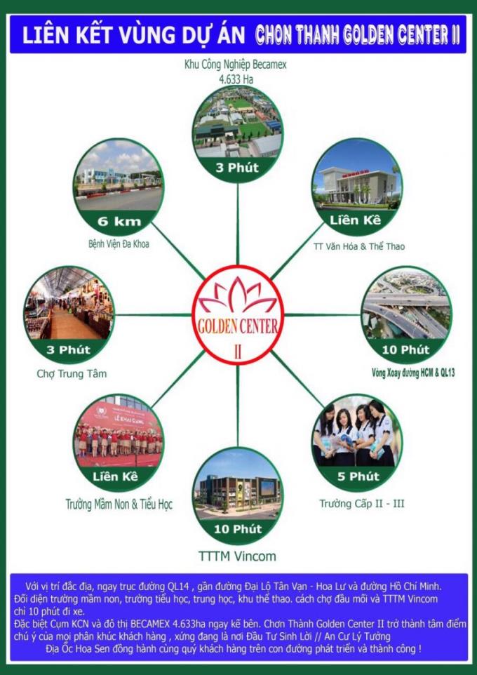 Chơn Thành Golden Center 2 là sản phẩm tiếp theo do Công ty CP địa ốc Hoa Sen làm chủ đầu tư tại Chơn Thành, Bình Phước. Dự án được triển khai trên quỹ đất quy hoạch rộng hơn 100ha với giai đoạn 1 sẽ gồm 400 sản phẩm đất nền.
