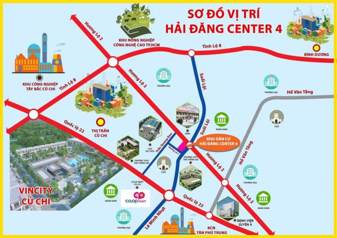 Đất nền Hải Đăng Center 4 Củ Chi có vị trí cực kỳ đắc địa ngay mặt tiền đường Suối Lội, xã Tân Thông Hội, huyện Củ Chi, Tp HCM. Là vị trí chiến lược trọng điểm của khu tây Tp HCM.