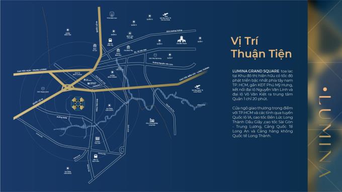 Lumina Grand Square tọa lạc tại mặt tiền đường Tỉnh lộ 835B, xã Phước Lý, huyện Cần Giuộc, tỉnh Long An. Dự án nằm gần giữa 3 trục xương sống của khu vực gồm Quốc Lộ 1A, đại lộ Nguyễn Văn Linh và đại lộ Võ Văn Kiệt.