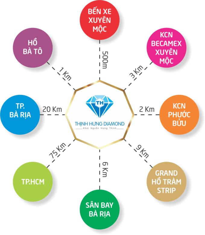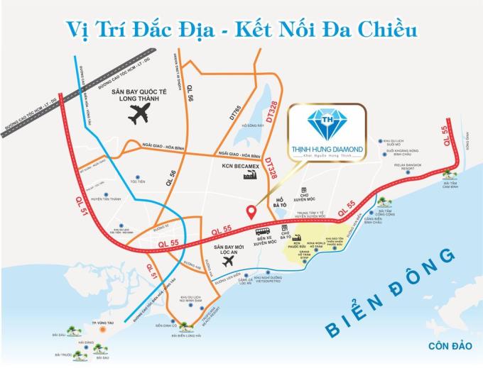 Dự án Thịnh Hưng Diamond sở hữu vị trí độc tôn đắt giá, tọa lạc ngay xã Phước Tân, huyện Xuyên Mộc, tỉnh Bà Rịa – Vũng Tàu. Đất nền Thịnh Hưng Diamond có lợi thế rất lớn khi nằm ngay mặt tiền quốc lộ 55, liền kề bến xe Xuyên Mộc nên giao thông kết nối của dự án hết sức thuận lợi.