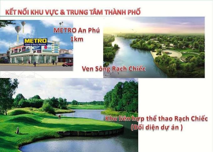 Ngoại khu: Cách Metro An Phú 1 km, KDC Thảo Điền 2 km. Nằm đối diện Khu liên hợp TT – sân Golf Rạch Chiếc. Nằm trong tổng thể quy hoạch chung của KDC Bắc Rạch Chiếc với quy mô 78 ha, bên cạnh cầu Rạch Chiếc giáp ranh Quận 2 với các tuyến đường huyết mạch cận kề như: Xa lộ Hà Nội, Hầm Thủ Thiêm( sắp hoàn thành ) & Cầu Thủ Thiêm( đường Nguyễn Hữu Cảnh ), Cao tốc Long Thành – Dầu Giây, đường Vành đai phía Đông( Cầu Phú Mỹ ). Tạo nên sự kết nối giữa dự án với Trung tâm TP.HCM, Quận 2, khu đô thị Phú Mỹ Hưng,…. trở nên gần hơn.
