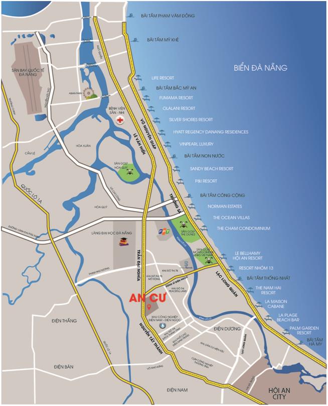 - 3km tới bãi tắm Viêm Đông, sân Golf Đà Nẵng, sân Golf Mongomerielink…