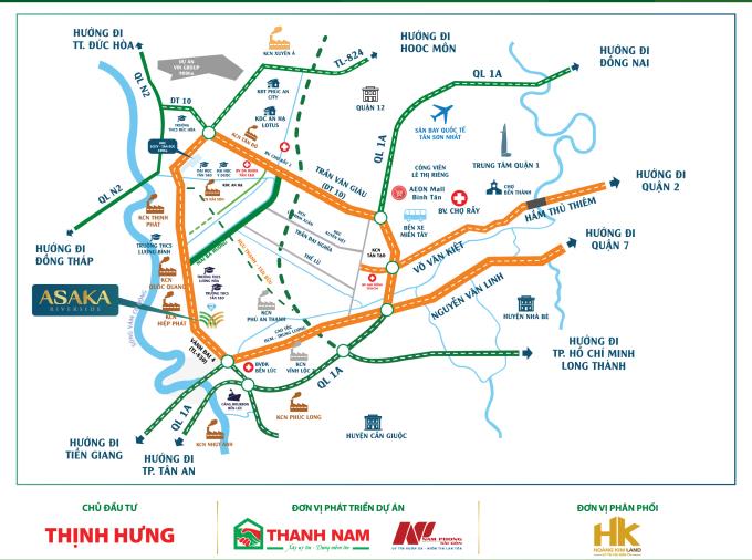 Dự án Asaka Riverside tọa lạc tại Huyện Lương Hòa, Huyện Bến Lức, Tỉnh Long An là khu vực tiếp giá với các tuyến đường huyết mạch như: