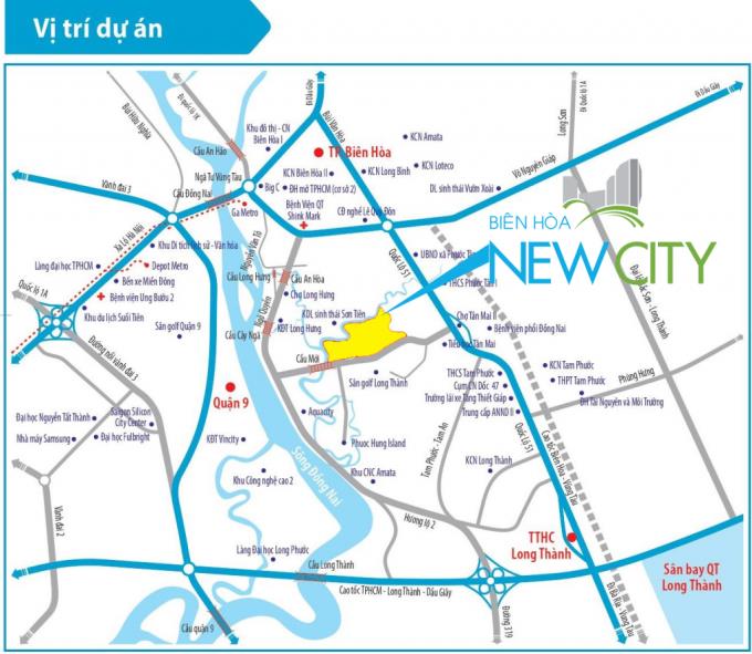 Biên Hòa New City tọa lạc tại khu tam giác kinh tế phía Nam, cách Trung tâm TP.HCM khoảng 40 phút đi xe. Bên hông Sân golf Long Thành được bình chọn là sân golf đẹp nhất, tốt nhất ở Việt Nam và là một trong những sân golf đẹp nhất Châu Á. Vì vậy, Khu Đô Thị Biên Hòa New City sẽ không thiếu các tiện ích đẳng cấp đi kèm theo để xứng tầm với tên gọi của nó: