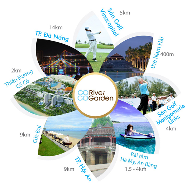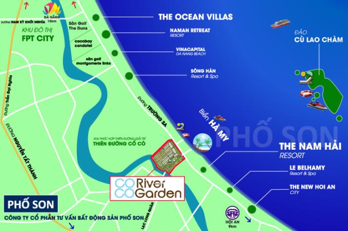 Coco River Garden nằm ở ngã tư Thống Nhất, đường Trường Sa, được xem là vùng chiến lược phát triển du lịch giáp ranh Đà Nẵng, Quảng Nam nên ngoài tiện ích nội khu hiện đại, đẳng cấp, trong vòng 3km, dự án được thừa hưởng các tiện ích của khách sạn 5 sao The Nam Hải Resort (400m), Naman Resort, Cocobay Condotel, 2 sân golf Quốc tế The Dunes và Montgomerie, Sông Hàn Resort & Spa, Le BelHamy Resort, Thiên đường Cổ Cò (tập đoàn Tuần Châu).