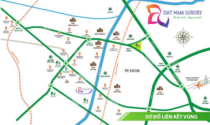 Dự án Đất Nam Luxury có vị trí thuận lợi trong khu vực, giáp ranh huyện Bình Chánh, quận Bình Tân TP. Hồ Chí Minh, nằm giữa 2 trục đường Vành Đai 3 và Vành Đai 4, nơi kết nối giao thương từ các tỉnh miền Đông sang miền Tây.