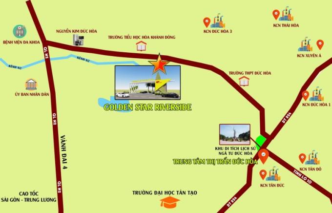 Dự án Golden Star Riverside được quy hoạch và phát triển tại Tỉnh lộ 824 thuộc xã Hòa Khánh Đông, huyện Đức Hòa, tỉnh Long An. Nơi đây đang hiện hữu sẽ được mở sang sông Vàm Cỏ Đông thành tuyến N1 & N2, nối toàn bộ các tỉnh miền Tây ra đến cửa khẩu Mộc Bài.