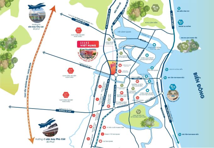 - Kết nối 2 Sân Bay Phù Cát và sân bay Chu Lai chỉ 45 phút đến 60 phút, xung quanh dự án là hệ thống trường học các cấp, trung tâm y tế, cơ quan hành chính, bãi tắm, chợ dân sinh,…phục vụ cho nhu cầu sinh hoạt thường ngày của cư dân.