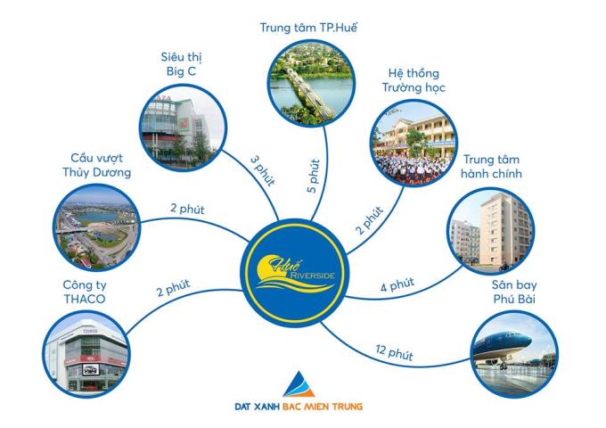Với tầm nhìn toàn cảnh sông Lợi Nông và các con kênh tươi mát, Hue Riverside sở hữu môi trường sống hàng đầu khu vực. Đây còn là cửa ngõ vào thành phố Huế từ hướng Đông Nam với lợi thế thiên nhiên trong lành, ít bị con người tác động. Các tiện ích hiện hữu đều rất gần với dự án: