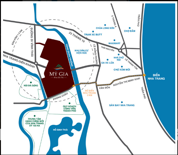 + 2 hướng chính đi vào Khu đô thị Mỹ Gia là đường Phong Châu và đường Vĩnh Thái cũng là 2 trục đường chính của trung tâm thành phố. Từ Vĩnh Thái có thể dễ dàng đi sân bay theo đường Lê Hồng Phong, hoặc ra quốc lộ 1 về phía nam theo đường 23 tháng 10.