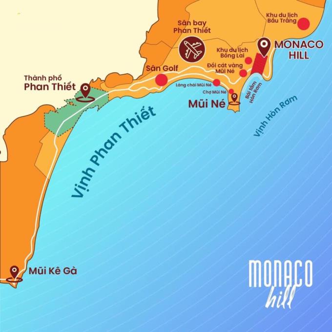 Monaco Hill Mũi Né là dự án đất nền biệt thự nghỉ dưỡng biển cao cấp với 350 căn biệt thự sang trọng và tiện nghi với công viên biển, bãi tắm riêng dài gần 1km, resort 5 sao, bến du thuyền, cầu vượt dây văng và sân golf 36 lỗ quy mô nhất tại Phan Thiết.