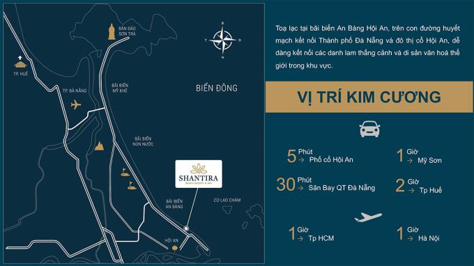 Vị trí Condotel Shantira Hội An được đánh giá là thỏi nam châm thu hút các nhà đầu tư. Nằm trên trục đường giao thông chính kết nối giữa Đà Nẵng và Hội An. Tuyến đường được ví như kinh đô của resort 5 sao. Nơi đây tập trung đầy đủ các thương hiệu khách sạn hàng đầu thế giới và cả trong nước. Có thể biết đến như Vinpearl, Sungroup, Cocobay …