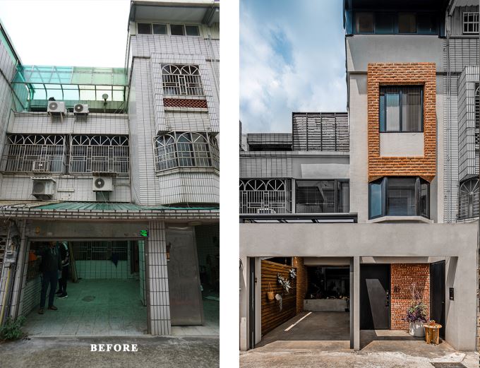 Trước và sau cải tạo: Mặt tiền thay đổi hoàn toàn, từ lớp gạch ốp cũ kỹ sang thiết kế thô mộc hiện đại với điểm nhấn gạch đỏ và gara mở