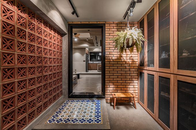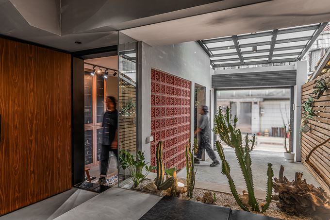 Hiên và sảnh vào thoáng sáng với gạch bông gió đỏ, tiểu cảnh xương rồng và nội thất gỗ mộc mạc, tạo ấn tượng ngay từ bước chân đầu tiên