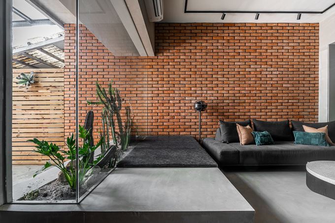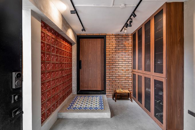 Ngoại thất giữ tinh thần thô mộc nhưng được tinh chỉnh để hiện đại hơn. Gara dùng cửa cuốn sắt thông gió, mặt tiền ốp gạch đỏ phủ lên nền gạch trắng, ban công tầng 3 điểm cây thông phương Nam nhuộm đen. Vật liệu được lựa chọn kỹ lưỡng, từ gỗ, sắt, kính, gạch đỏ Đài Loan, gạch Đông Nam Á, terrazzo, gạch kính đến ngói hoa truyền thống – tất cả cùng kể câu chuyện về sự giao thoa giữa cũ và mới.