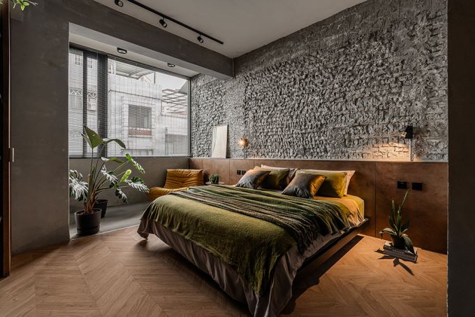 Phòng ngủ chính ấm áp với tường bê tông trần giữ nguyên kết cấu, kết hợp tông xanh rêu và gỗ, mở ra tầm nhìn thoáng sáng