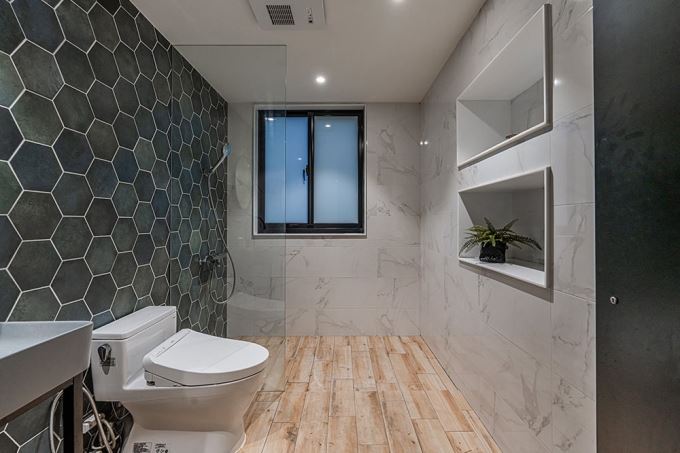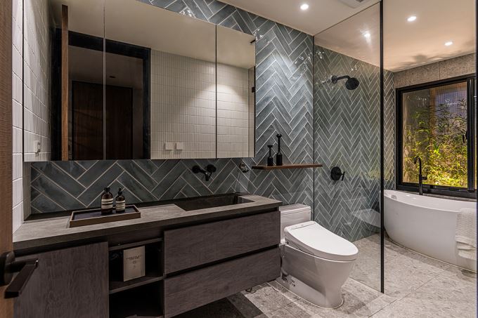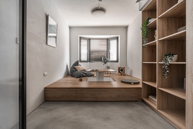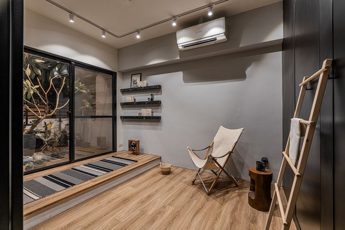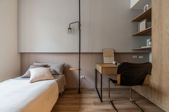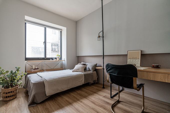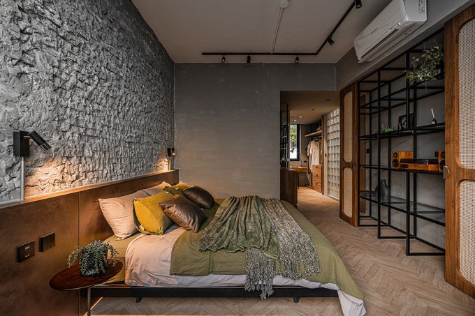 Phòng ngủ chính giữ nguyên tường trần, sơn màu xám bùn để lộ kết cấu nguyên bản; phòng trẻ em dùng tông sáng kiểu MUJI; các phòng tắm lấy cảm hứng từ màu xanh cây cối hoặc họa tiết gạch truyền thống Đài Loan. Ngay cả phòng giặt, phòng đa năng hay phòng nghe nhìn trên cao cũng tận dụng ánh sáng, thông gió tự nhiên và vật liệu giản dị.