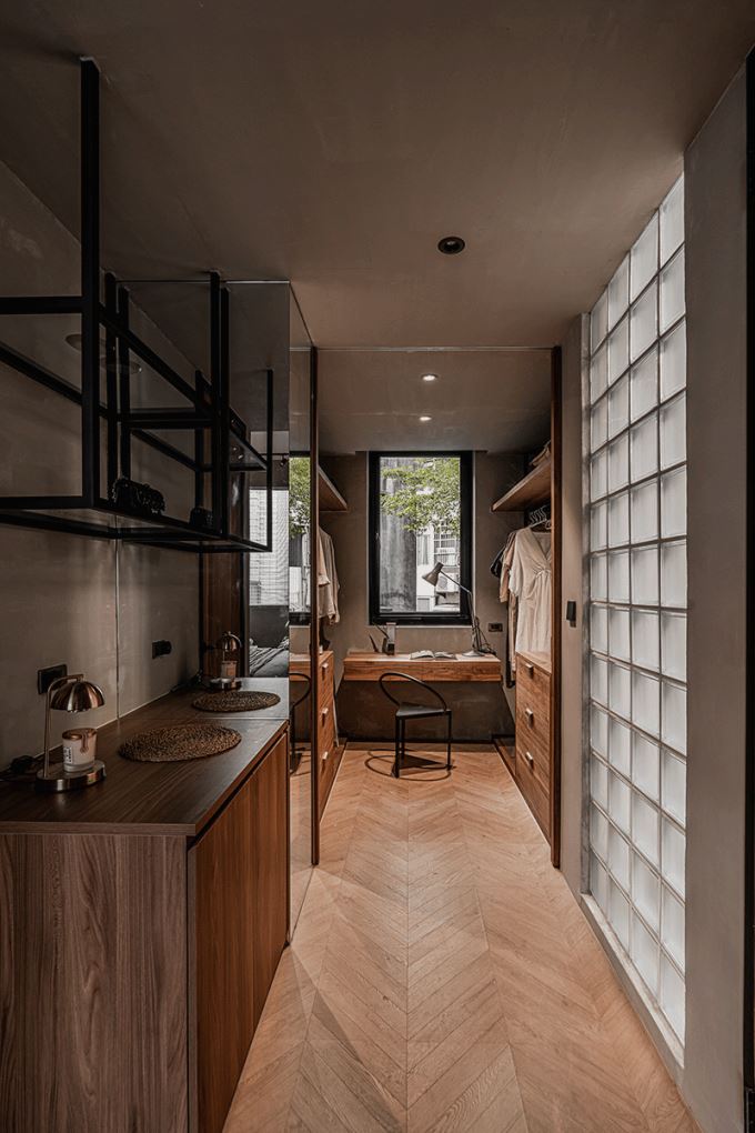 Phòng thay đồ sử dụng gạch kính lấy sáng và nội thất gỗ ấm áp, tối ưu sự tiện nghi và thoáng sáng