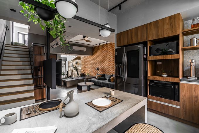 Một khung cảnh thanh bình mở ra ngay khi bước vào ngôi nhà lệch tầng ba thập kỷ tuổi tại Hsinchu. Dưới bàn tay cải tạo của Sirui Interior Design và Laopai Design Studio, công trình đã thay lớp áo cũ kỹ bằng hơi thở đương đại, nhưng vẫn giữ vẻ chân thực nhờ vật liệu nguyên bản. Giếng trời được mở rộng, một số tường ngăn được dỡ bỏ để ánh sáng và gió len lỏi tự do. Từ cầu thang, bức tường TV, đến trần và tường, tất cả đều sử dụng chất liệu mộc mạc như sắt, gỗ tối màu, gạch đỏ, sàn terrazzo… tạo cảm giác vừa thô ráp vừa ấm áp.