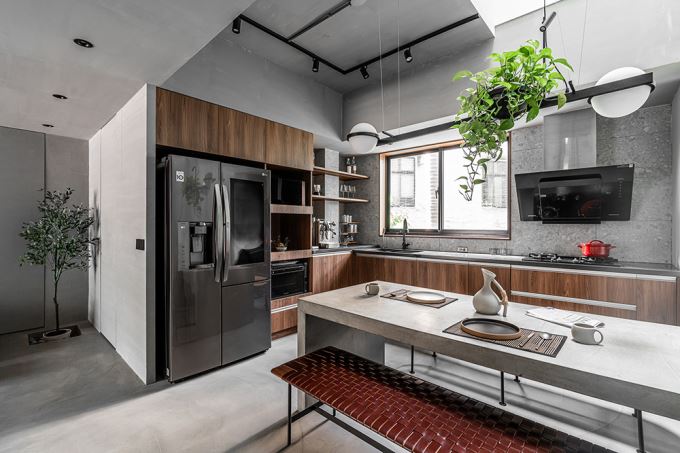 Khu bếp – ăn hiện đại với nội thất gỗ ấm áp, bàn ăn bê tông liền khối và cây xanh treo tạo điểm nhấn sinh động