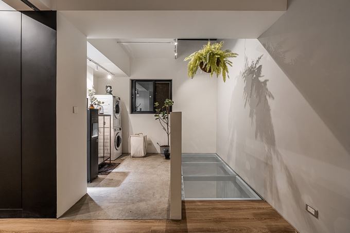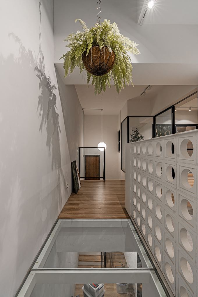 Khu giặt phơi và hành lang với sàn kính lấy sáng, kết hợp cây treo trang trí, mang lại sự thông thoáng và sinh động cho không gian