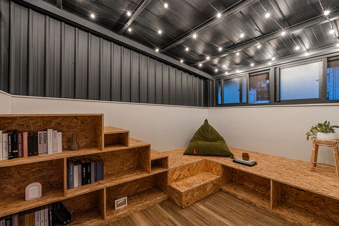 Nằm trên tầng 1,5, Phòng đa năng với sàn gỗ nâng, bàn trà âm và hệ kệ mở, tạo không gian thư giãn, đọc sách hay tiếp khách thân mật