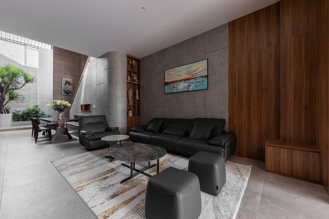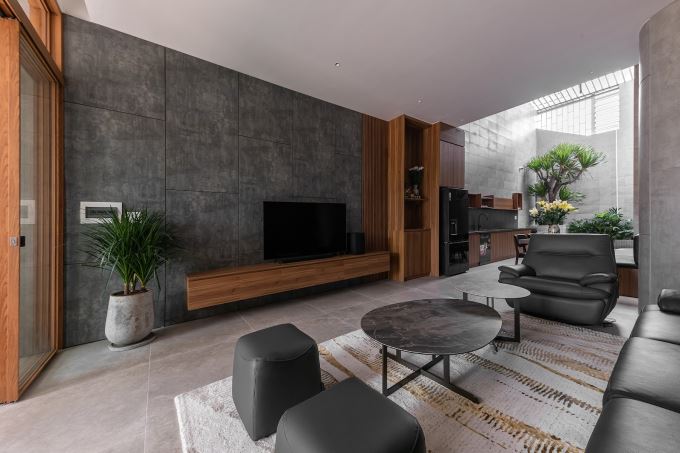 Toàn bộ công trình được hoàn thiện với chất liệu chủ đạo là gỗ, đá xám và kính – tinh giản nhưng đủ chiều sâu. Mặt tiền ấn tượng với lam đứng, ban công và mảng xanh tầng lửng, tạo nên mặt đứng hiện đại mà không phô trương. Thiết kế mặt tiền vừa thỏa mãn yêu cầu thông thoáng, vừa đảm bảo yếu tố che nắng, giảm nhiệt – một trong những yêu cầu quan trọng với nhà phố.