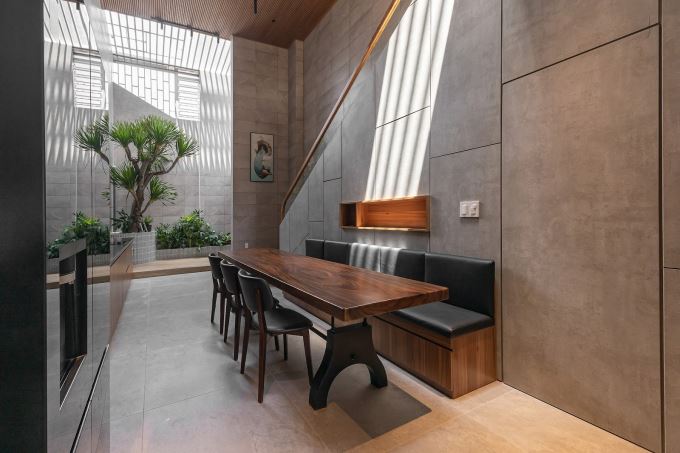 Không gian sinh hoạt chung như bếp, phòng khách, bàn ăn được bố trí xoay quanh lõi ánh sáng này. Nhờ vậy, dù nằm trong nhà ống điển hình ở đô thị, ngôi nhà vẫn có được sự thông thoáng, không bị bí bách hay phụ thuộc quá nhiều vào thiết bị cơ học.