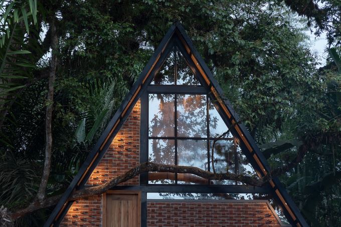 Ngay từ mặt tiền, A Shelter in the Forest gây ấn tượng với thiết kế mái nhà dốc lợp bằng tấm cubiteja chống chịu thời tiết. Độ dốc của mái lớn giúp thoát nước mưa nhanh chóng, dễ dàng bố trí thêm tầng lửng, đồng thời tạo sự kết nối giữa khối kiến trúc với cảnh quan thiên nhiên xung quanh.