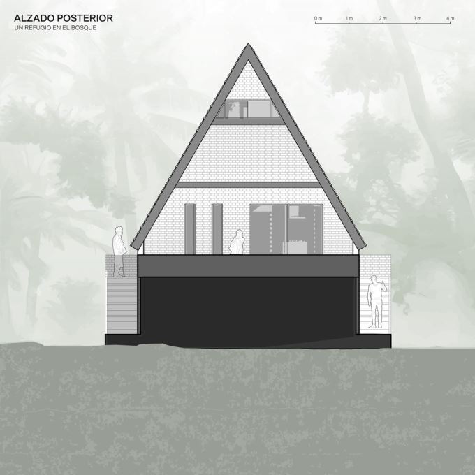 A Shelter in the Forest được xây dựng trên nền bê tông cao, đây là giải pháp thiết kế giúp ngôi nhà thích ứng tốt với địa hình dốc và tránh được độ ẩm cao. Về vật liệu, ngôi nhà mái dốc này chủ yếu sử dụng gỗ, gạch và thép, tạo nên cấu trúc vững chắc nhưng vẫn giữ nét đẹp thô mộc, ấm cúng và gần gũi.