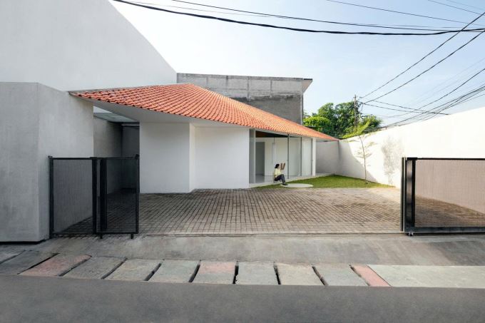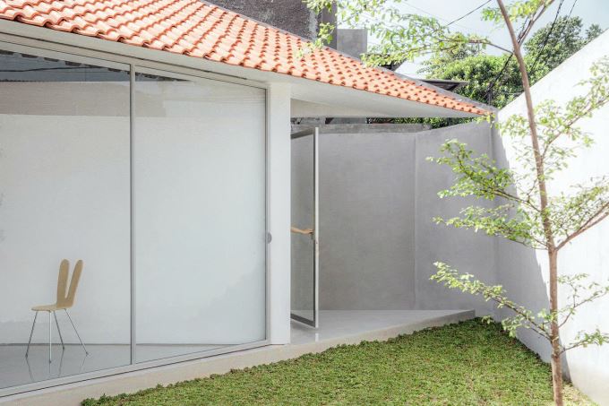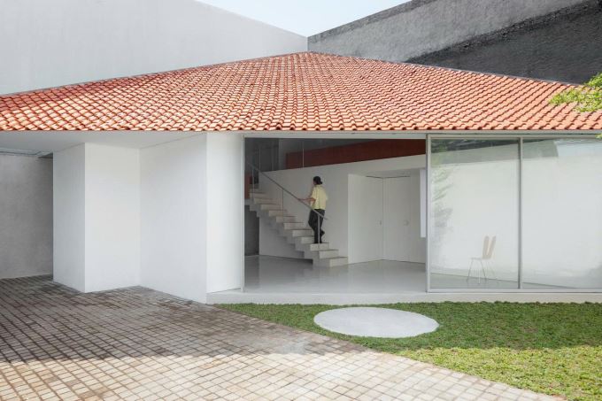 Mái ngói đỏ truyền thống tạo điểm nhấn trên nền tường trắng tối giản, mở ra khoảng sân tam giác đóng vai trò "lá phổi xanh" cho toàn bộ công trình