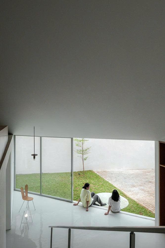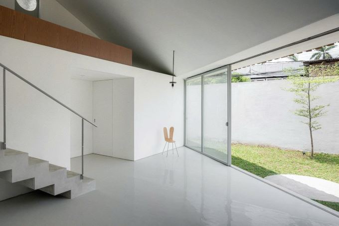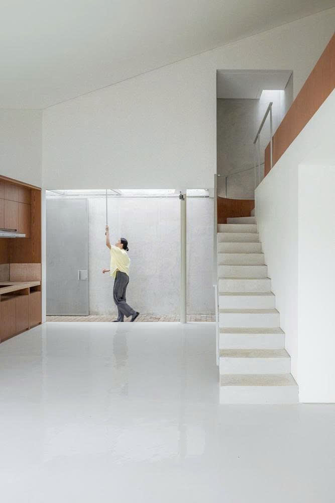 Kiến trúc sư đã khai thác tối đa các nguồn lấy sáng tự nhiên thông qua mái nghiêng, giếng trời và cửa sổ cao sát trần. Những khe sáng này cung cấp ánh sáng suốt ngày, đồng thời tạo nên hiệu ứng “mở rộng bầu trời”, giúp ngôi nhà nhỏ như tỏa sáng giữa thành phố đông đúc.