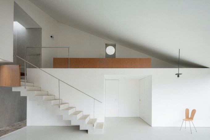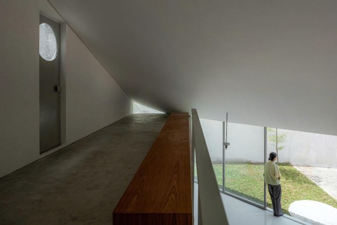 Sự giao thoa giữa trần nghiêng và ô cửa tròn mang lại “chất thơ” riêng biệt cho thiết kế Two Triangles House