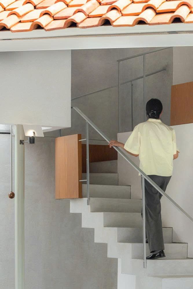 Mái ngói truyền thống cùng tay vịn mảnh giúp cầu thang trở thành điểm chuyển tiếp nhẹ nhàng giữa kiến trúc bên ngoài và nội thất bên trong