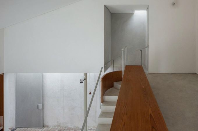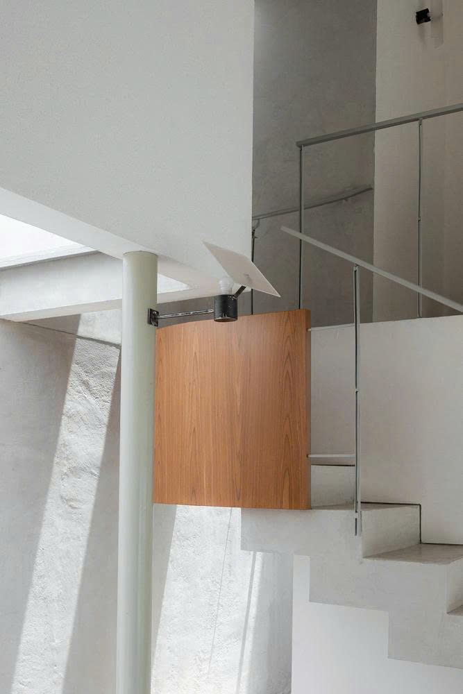 Cầu thang bê tông không tay vịn truyền thống được thay bằng tay nắm kim loại thanh mảnh, tăng tính hiện đại và giữ tinh thần tối giản