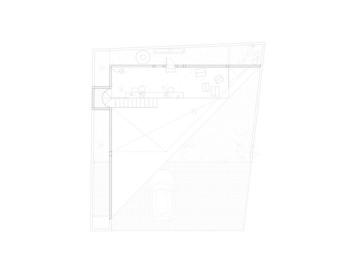 Xuất phát từ một khu đất góc phố hình chữ nhật rộng 150m2, nhóm thiết kế từ dua studio đã đưa ra quyết định bất ngờ đó là chia khu đất theo đường chéo, tạo thành hai hình tam giác có diện tích gần bằng nhau. Một hình được dành cho khối nhà ở, hình còn lại trở thành sân vườn và không gian mở.