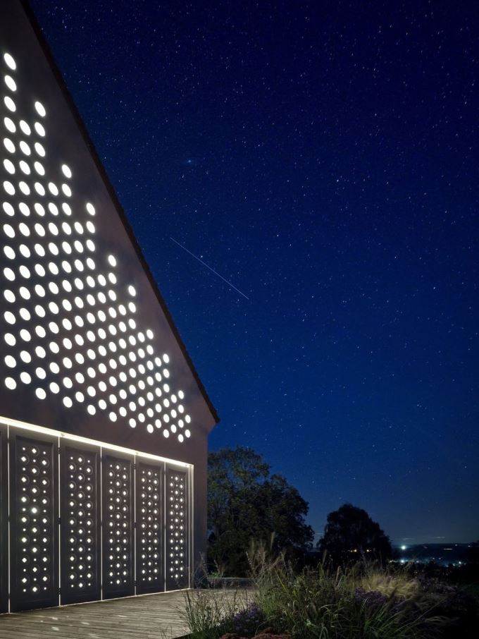 Vào ban đêm, ánh sáng đảo ngược hướng, tỏa sáng từ ngôi nhà ra cảnh quan xung quanh nhờ các hốc tường phát sáng