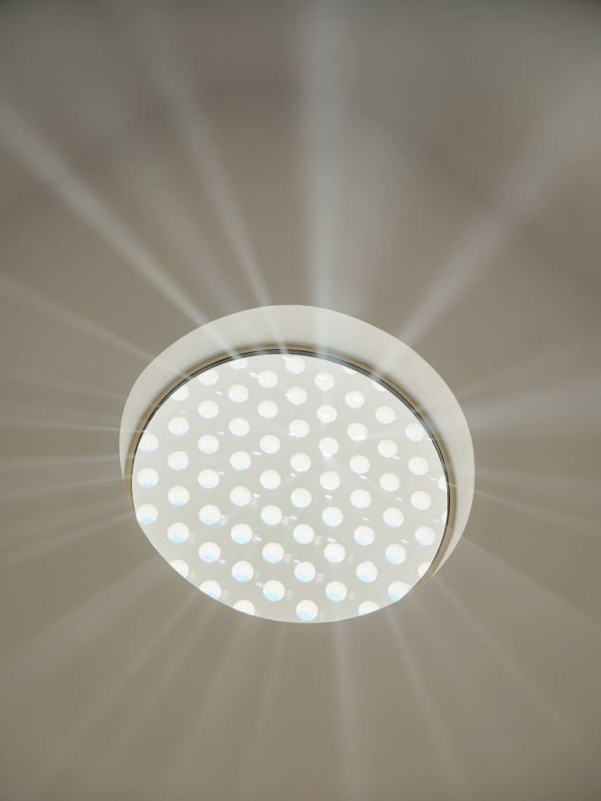 Những ô cửa sổ nhỏ trên mái giúp chiếu sáng không gian nhỏ gọn màu trắng, thể hiện rõ hình dạng của các hốc và phần mái vòm.