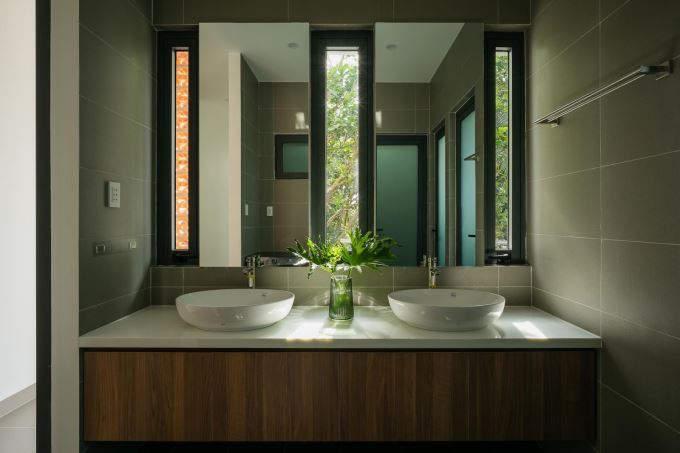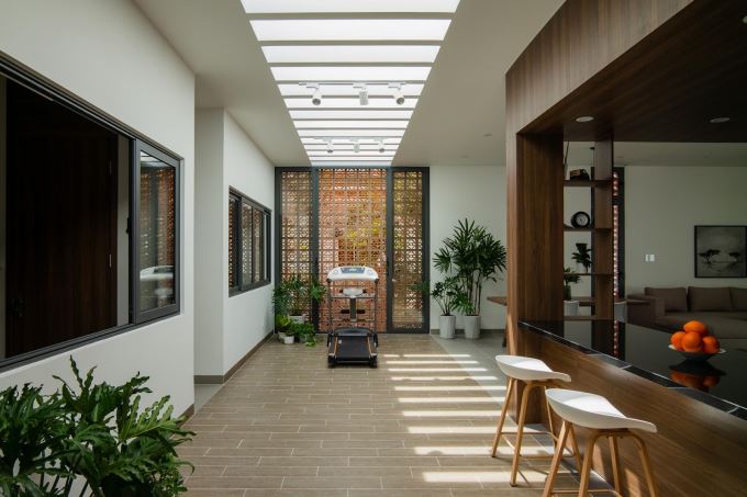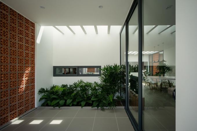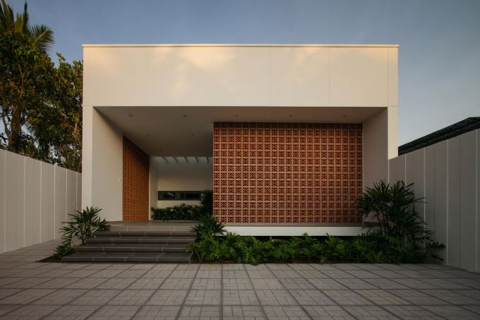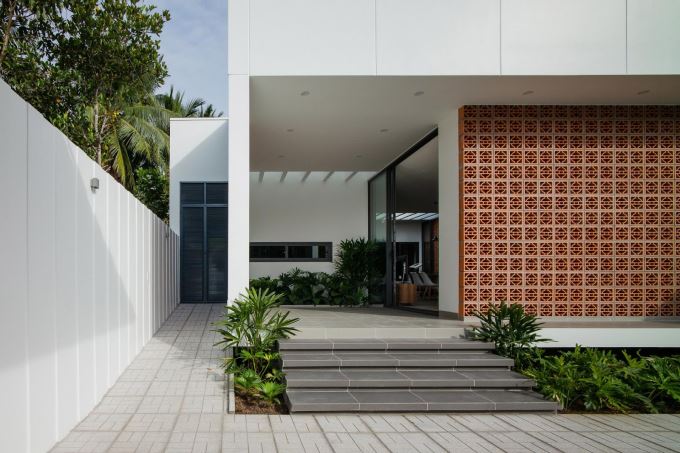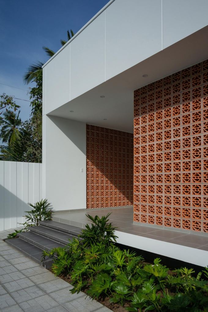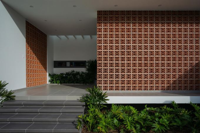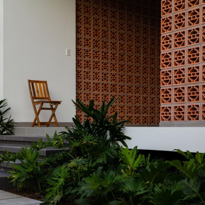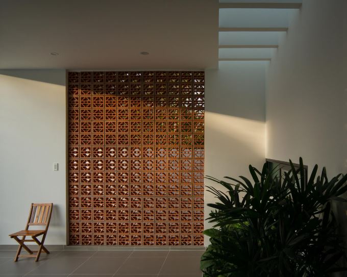 Công trình sử dụng gạch thông gió bằng đất nung, màu gỗ trầm trên nền sơn trắng, kết hợp các mảng xanh, tạo nét hiện đại pha chút thô mộc hòa lẫn với thiên nhiên. Các chất cảm này đem lại cảm giác ấm áp và thư giãn cho gia đình.