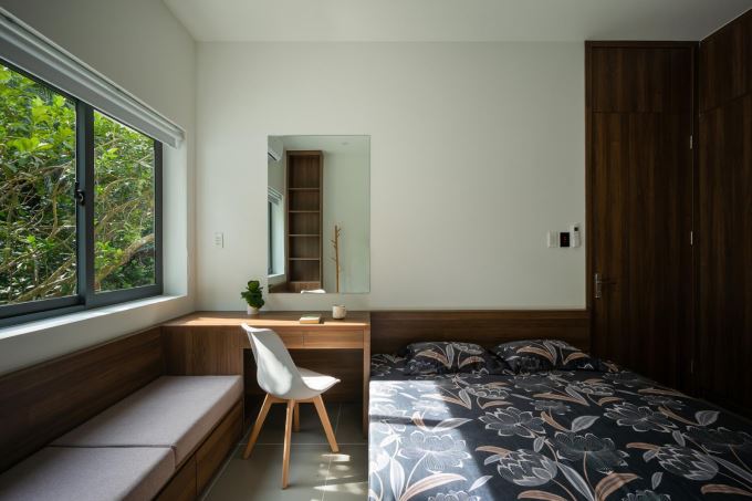Khu đất thiết kế cách trung tâm thành phố Bến Tre khoảng 10km, có diện tích khá rộng và mặt tiền hướng Tây. Với tiêu chí thiết kế trên, kiến trúc sư đã chọn phương án nhà một tầng, tách biệt khu sinh hoạt và khu nghỉ ngơi bằng khoảng sân giữa nhà. Khoảng sân này là không gian kết nối các thành viên trong gia đình, có chức năng linh hoạt, vừa là nơi thư giãn, góc làm việc, tập thể dục, khu chơi đùa của con cái. Cây xanh được đặt xen kẽ vào các không gian, giúp không khí thêm trong lành và mát mẻ.