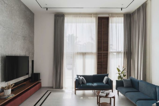 Nội thất gỗ, rèm vải hai lớp và bộ sofa màu xanh tạo nên bức tranh cân bằng giữa vật liệu và ánh sáng tự nhiên