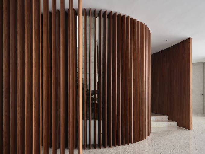 Hệ lam gỗ xếp tròn quanh cầu thang xoắn ốc đôi khi tạo nên hiệu ứng ánh sáng kết hợp vân gỗ đẹp hút mắt