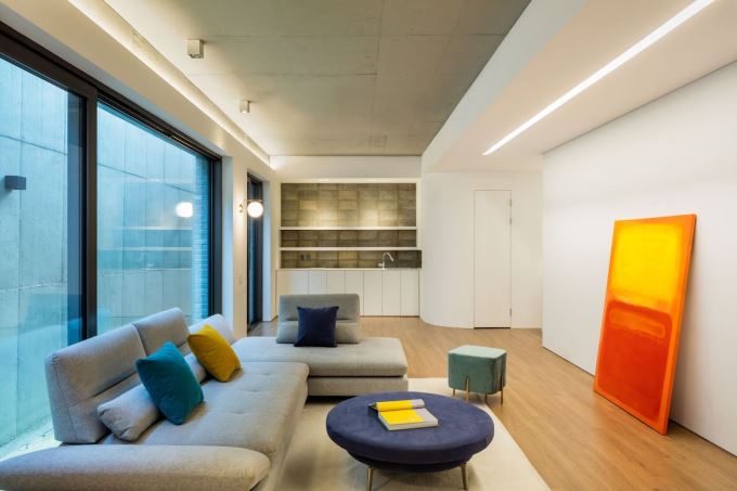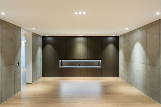 Không gian đa năng với tường bê tông trần và hệ tủ ốp kín, gợi chất công nghiệp sang trọng, cá tính