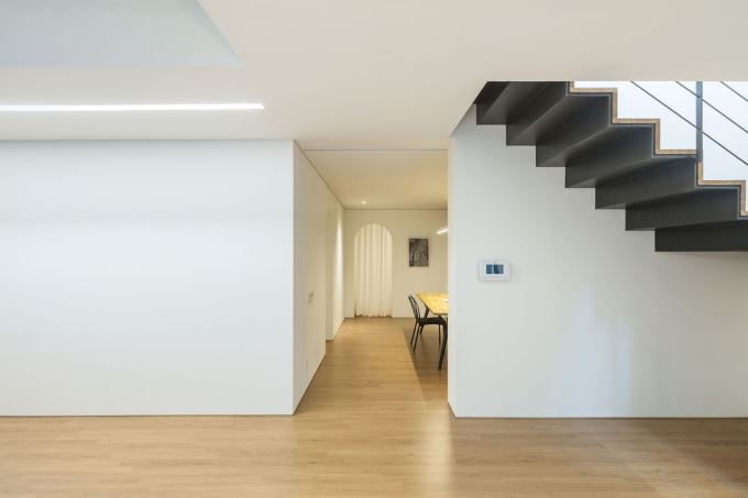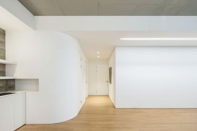 Mảng tường cong mềm mại dẫn lối, tạo điểm nhấn thị giác trong không gian tối giản
