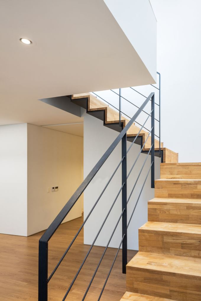 Cầu thang thép kết hợp gỗ, tạo nhịp điệu chuyển tiếp giữa các tầng với độ thoáng tối đa