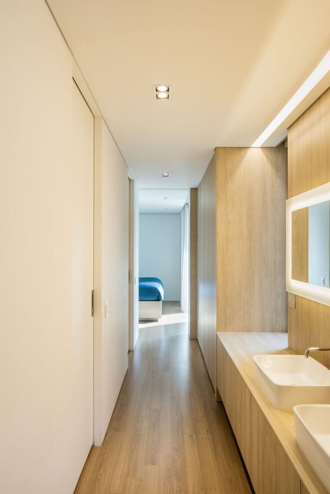 Hành lang tối giản với đèn âm tường và cửa sổ lớn, mở tầm nhìn ra mảng xanh bên ngoài